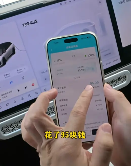 最终,车辆从17%充到100%,一共充入73度电,花费95元,全程耗时31分钟。