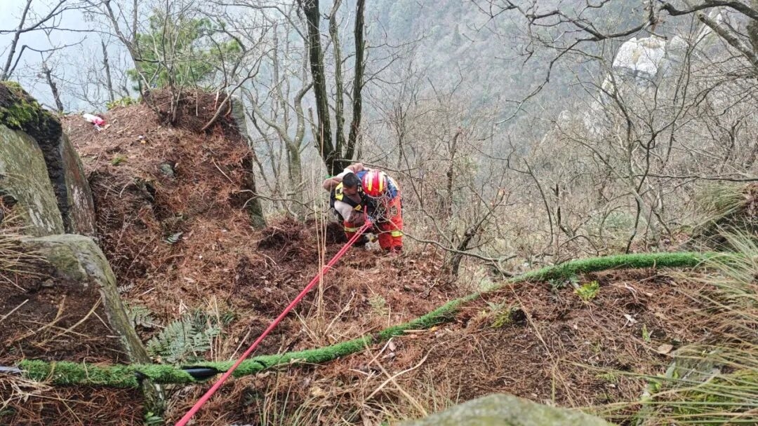 救援人员随即利用周边大树架设安全锚点,搭建绳索倍力系统,一名救援人员通过绳索下降至被困位置,先为男孩穿戴好全身安全吊带并抱护在胸前,平稳转移至安全区域,随后再将孩子父亲成功救出,整个救援过程持续近一小时。