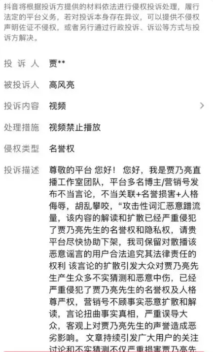 今日,“贾乃亮举报博主”冲上热搜,引发网友热议。据了解,贾乃亮工作室以侵犯名誉权为由,向平台投诉抖音博主 “高风亮” 的相关视频,平台审核后判定投诉成立,已对涉事视频采取禁止播放、下架处理。