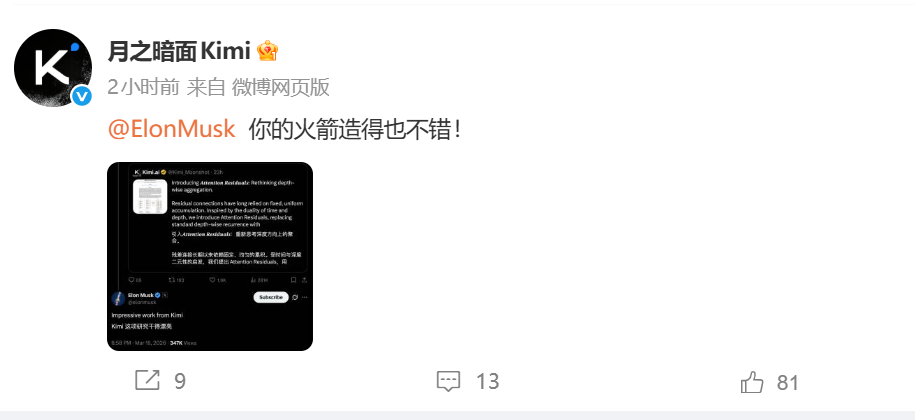 在特斯拉CEO埃隆·马斯克公开点赞中国AI公司Kimi的最新研究成果后,Kimi官方账号今日以幽默口吻回应:“你的火箭造得也不错!”近日,Kimi团队发布技术报告,提出全新Attention Residuals(注意力残差)机制,对深度学习领域沿用近十年的传统残差连接实现颠覆性重构,迅速获得全球关注。