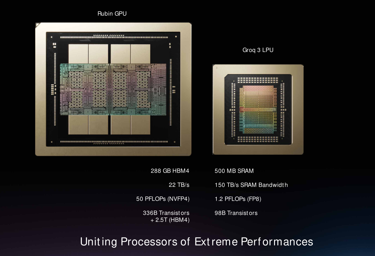 这个产品的单芯片叫做LPU30,三星代工制造,整合500MB SRAM缓存,980亿晶体管,FP8性格1.2PFLOPS,AI算力性能远不如Rubin GPU,但150TB/s的带宽远高于HBM4的22TB/s。