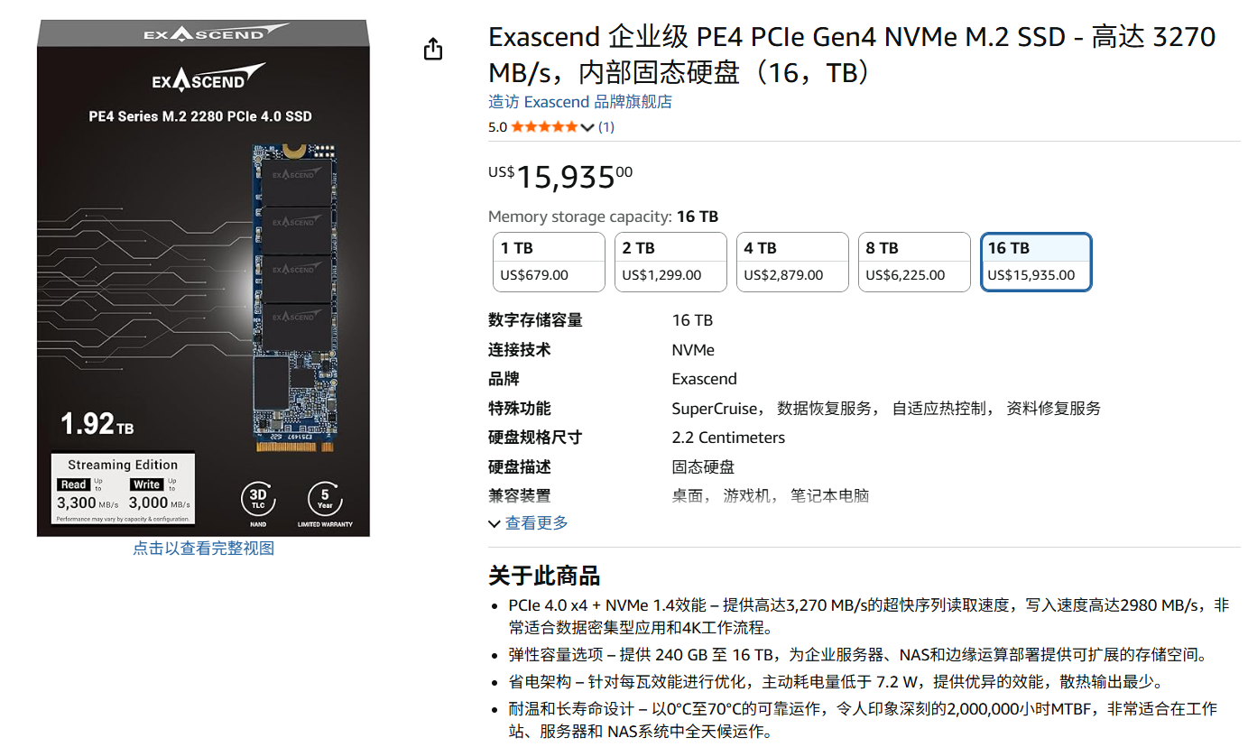 亚马逊上已经有卖的了,标价15935美元,约合人民币10.95万元,相当于每TB 7100多元。
