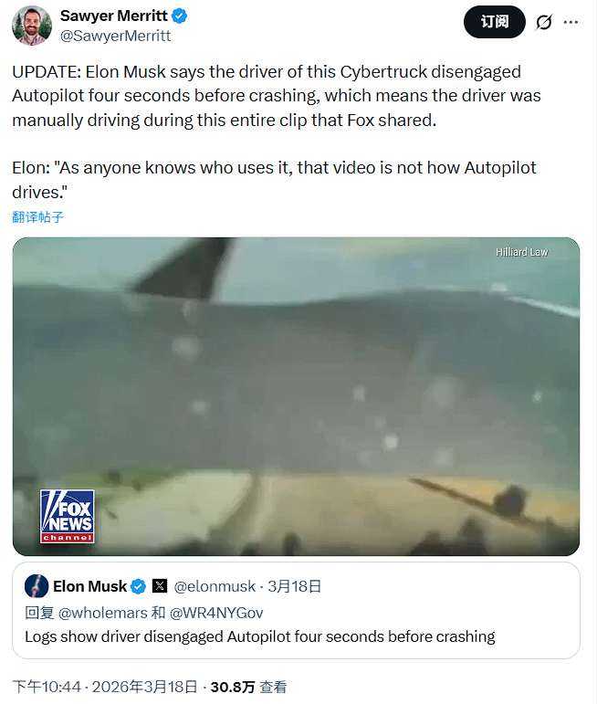 针对此事,特斯拉CEO马斯克近日在社交平台X上进行回应:驾驶日志已经显示,驾驶员在碰撞前四秒主动关闭了Autopilot