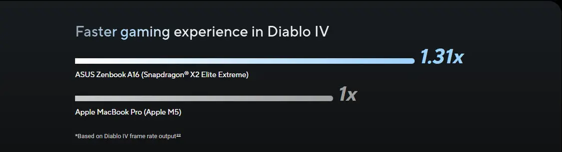 在游戏性能方面,华硕官方数据显示,Zenbook A16在运行《暗黑破坏神4》时的帧率是M5 MacBook Pro的1.31倍。然而,由于该游戏目前尚未推出macOS原生版本,苹果设备必须依赖如CrossOver等转译软件运行,这种兼容层的存在会带来不可避免的性能损耗,导致该项对比并非在同等原生环境下进行。