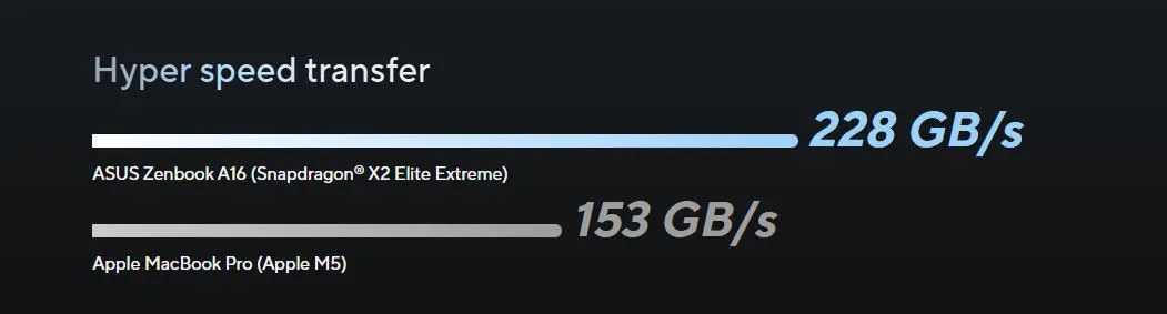 在数据传输能力的表述上,华硕宣传物料展示Zenbook A16具备228 GB/s的“超高速传输”,并对比了M5的153 GB/s。这一表述将系统级芯片(SoC)内部共享内存池的统一内存带宽理论峰值,与实际的外部数据传输率相混淆。业界指出,日常程序运行极难触及这一理论带宽上限,且两个概念在技术本质上存在显著差异。