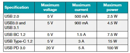 然后他又介绍了当前USB接口的一些发展情况,文章主要谈的是供电能力,科普了USB接口充电的过程,目前几种接口的供电规范如下所示: