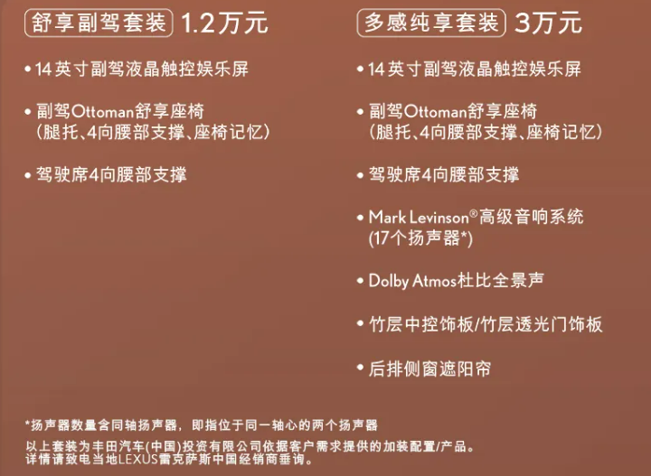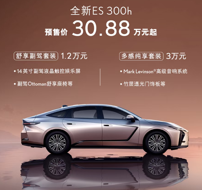 全新一代雷克萨斯ES今日预售,目前仅推出ES300 h车型,价格为30.88万起,同时同步推出舒享副驾套装、多感纯享套装,价格分别为1.2万元和3万元。