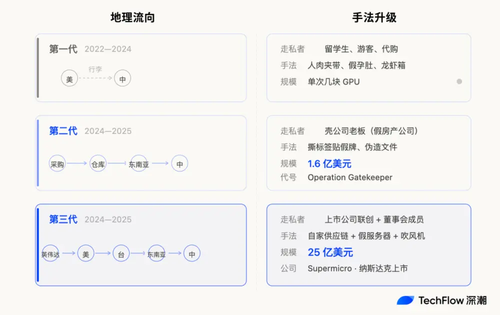 往回看两年,芯片走私这门生意经历了三代进化。参与者的身份一路升级,手法越来越像正经生意,规模越来越大。
