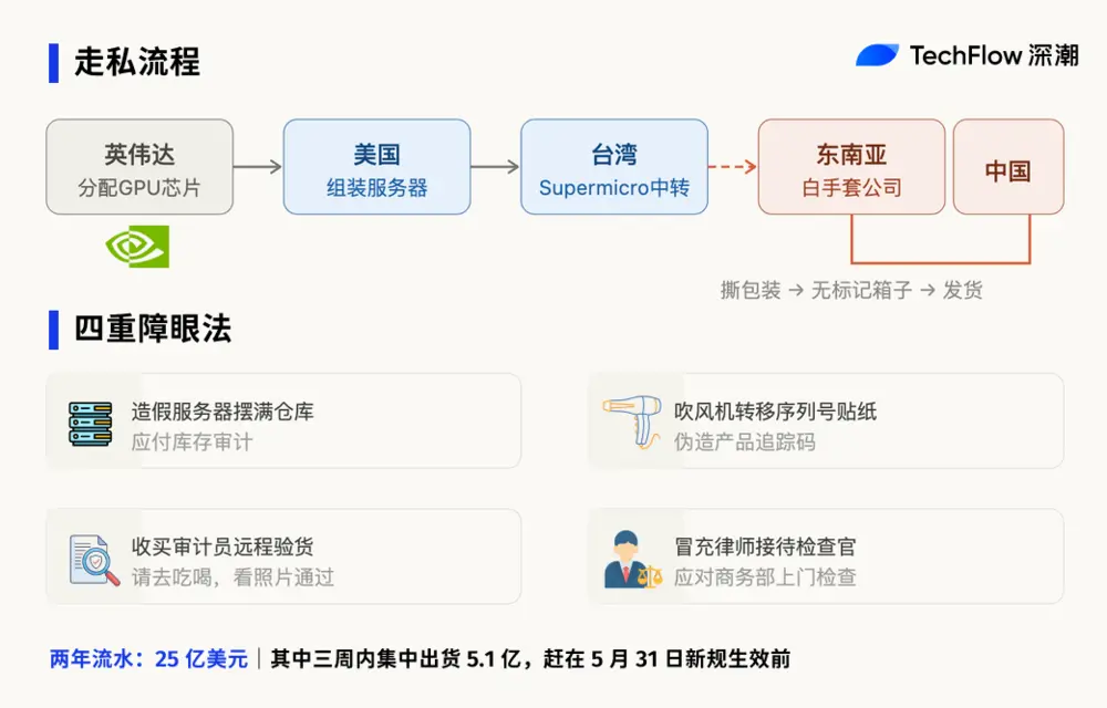 先确认中国买家的需求量,再拿这个量去跟英伟达谈配额,理由是东南亚公司“自用”。英伟达批了额度,服务器在美国组装,运到台湾,再转交给东南亚公司,东南亚公司拆掉包装发往中国。