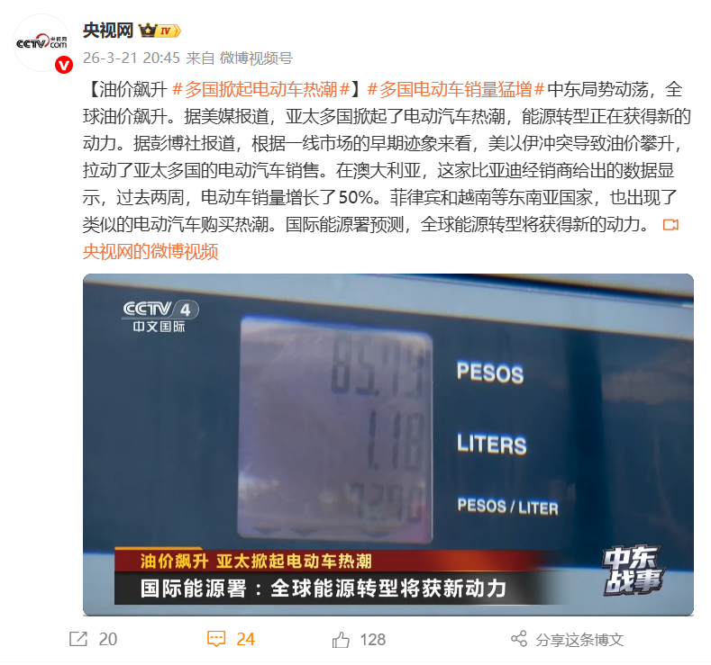 美伊伊冲突在亚太地区引发能源消费习惯的转型,澳大利亚只是一个缩影,菲律宾和越南等东南亚国家也出现了类似的电动汽车购买热潮。国际能源署预测,全球能源转型将获得新的动力。