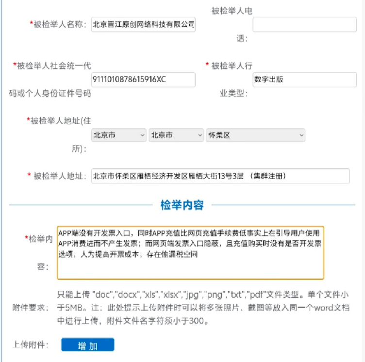 还有用户指出,在晋江的APP客户端并无直接申请发票的选项,用户必须通过网页端,经历“登录→财务→余额→开发票”四级菜单才能找到入口,操作极为繁琐。有用户认为此举可能构成“少列收入”,存在偷逃增值税及企业所得税的嫌疑,向税务部门投诉北京晋江原创网络科技有限公司,要求核查其是否存在偷漏税行为。