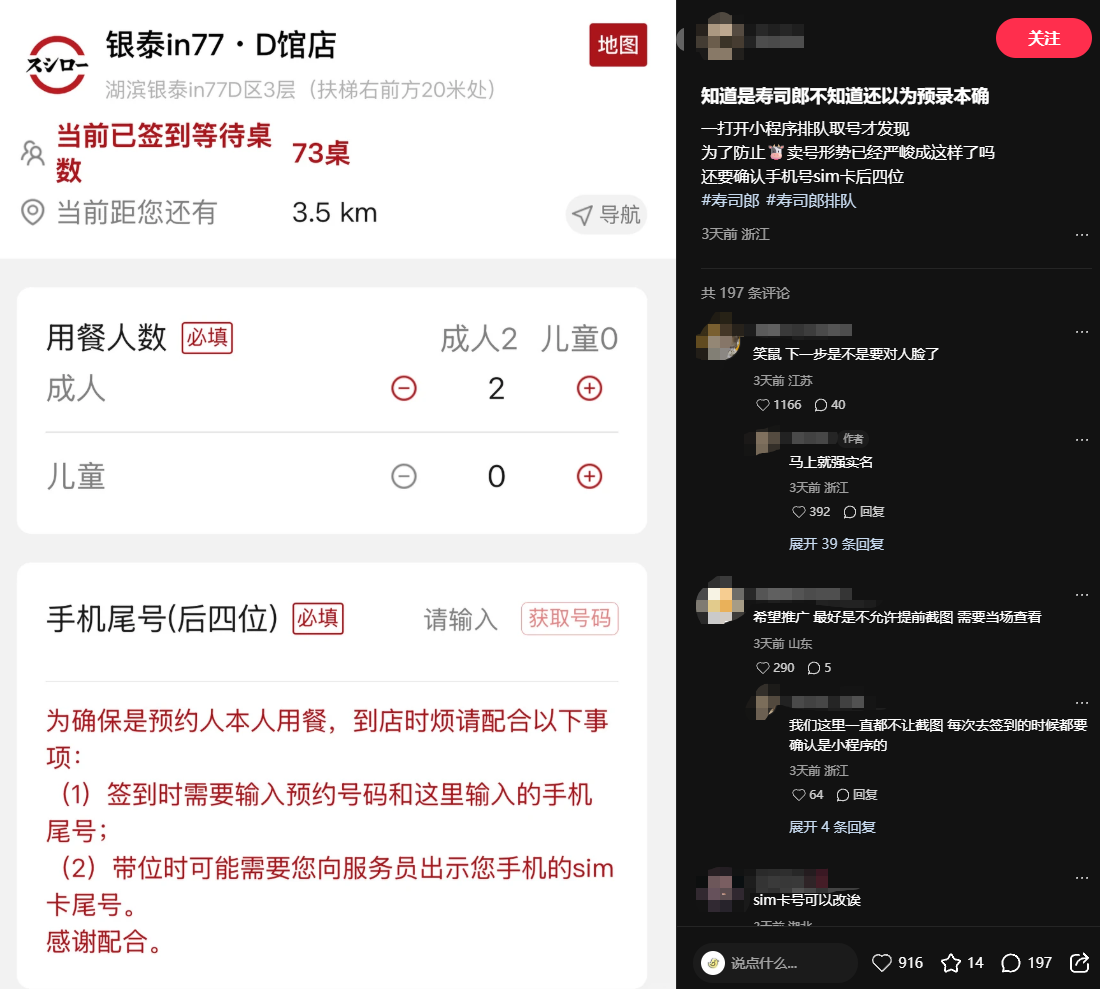 今日,“寿司郎 SIM卡”话题冲上微博热搜第二,引发广泛关注与讨论。事件起因于有网友在社交平台发帖称,在寿司郎小程序预约取号后,到店签到不仅需要输入手机号尾号,还可能被要求出示手机SIM卡尾号进行核验。