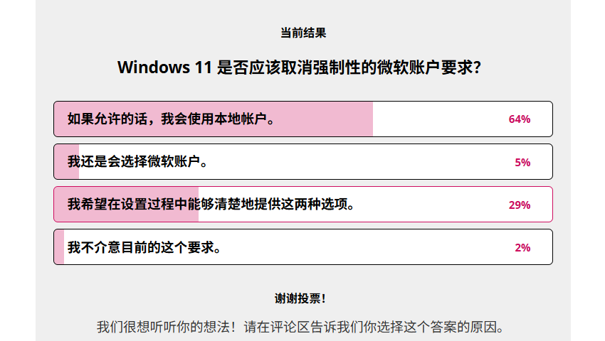 WindowsCentral资深编辑ZacBowden随即发起用户调查,结果显示64%的受访者明确表示若有选择会优先使用本地账户,29%希望同时保留两种登录方式,仅有5%会坚持使用微软账户,仅2%对强制政策无异议。