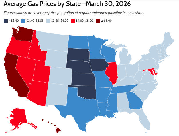目前,三个州的平均油价超过每加仑5美元:加利福尼亚州以5.88美元位居榜首,其次是夏威夷州和华盛顿州。另有多个州——内华达州、俄勒冈州、亚利桑那州、阿拉斯加州、爱达荷州、伊利诺伊州、犹他州和马里兰州——以及华盛顿特区,目前的平均油价超过每加仑4美元。