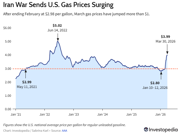 据美国汽车协会(AAA)的数据显示,自3月初以来,全美平均汽油零售价格已经上涨了1美元多,当时全美平均价格为2.98美元。下图揭示了油价是如何在短短不到一个月时间里快速飙升的: