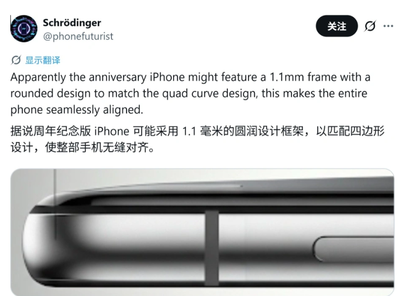 据报道,苹果20周年纪念版iPhone 20将采用1.1毫米极窄屏幕边框,搭配极致圆润的边缘处理与四曲面瀑布屏设计,整机视觉效果接近无缝玻璃面板。此次曝光的设计核心为真全面屏形态,为配合1.1毫米窄边框,iPhone 20采用四边均向中框自然弯曲的四曲面屏幕,进一步弱化边框存在感,提升正面屏占比与一体感。