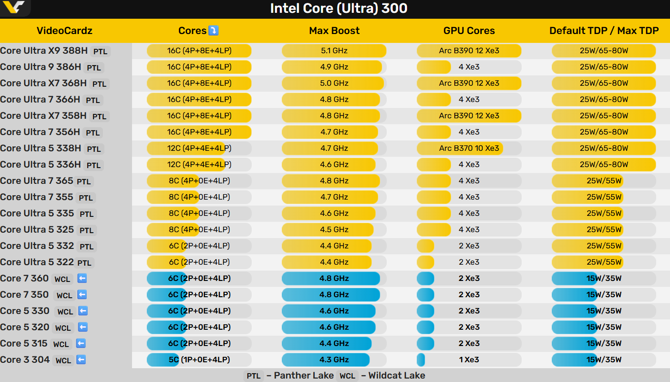 Wildcat Lake全系列一共六款不同型号,旗舰是酷睿7 360,2P+4LPE 6核心