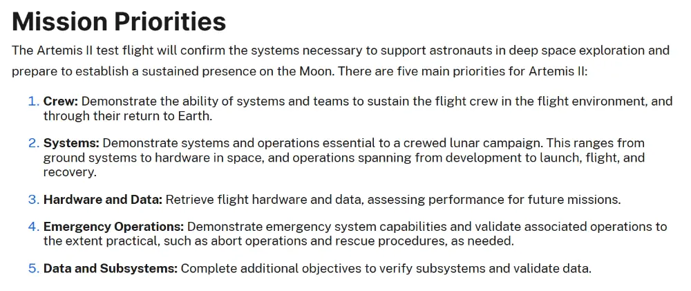 阿尔忒弥斯2号任务优先级 | 图源:NASA