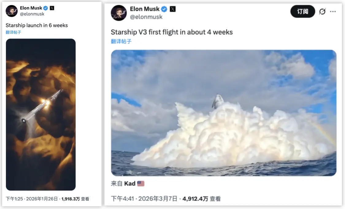作为背景,马斯克今年1月26日曾发帖称,“星舰”将在6周内发射,也就是3月9日前。随后,马斯克又在3月7日发帖称,V3版“星舰”首飞大约在4周后。4周期限将至之际,最新的日期又变成了5月。