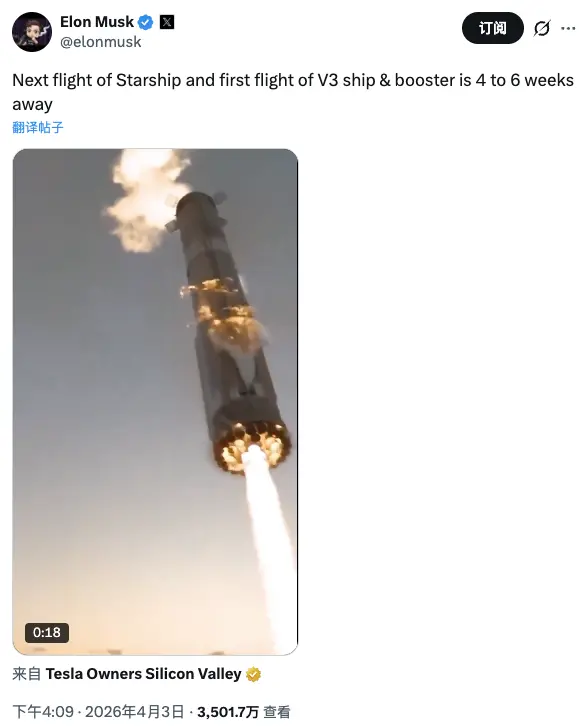 北京时间周五,世界首富马斯克在社交媒体上宣布,V3版“星舰”飞船与助推器还要再等待4至6周。按照这个时间表推算,备受资本市场期待试飞至少推迟到5月中上旬,距离传闻中的SpaceX上市也只有一个月的间隔。