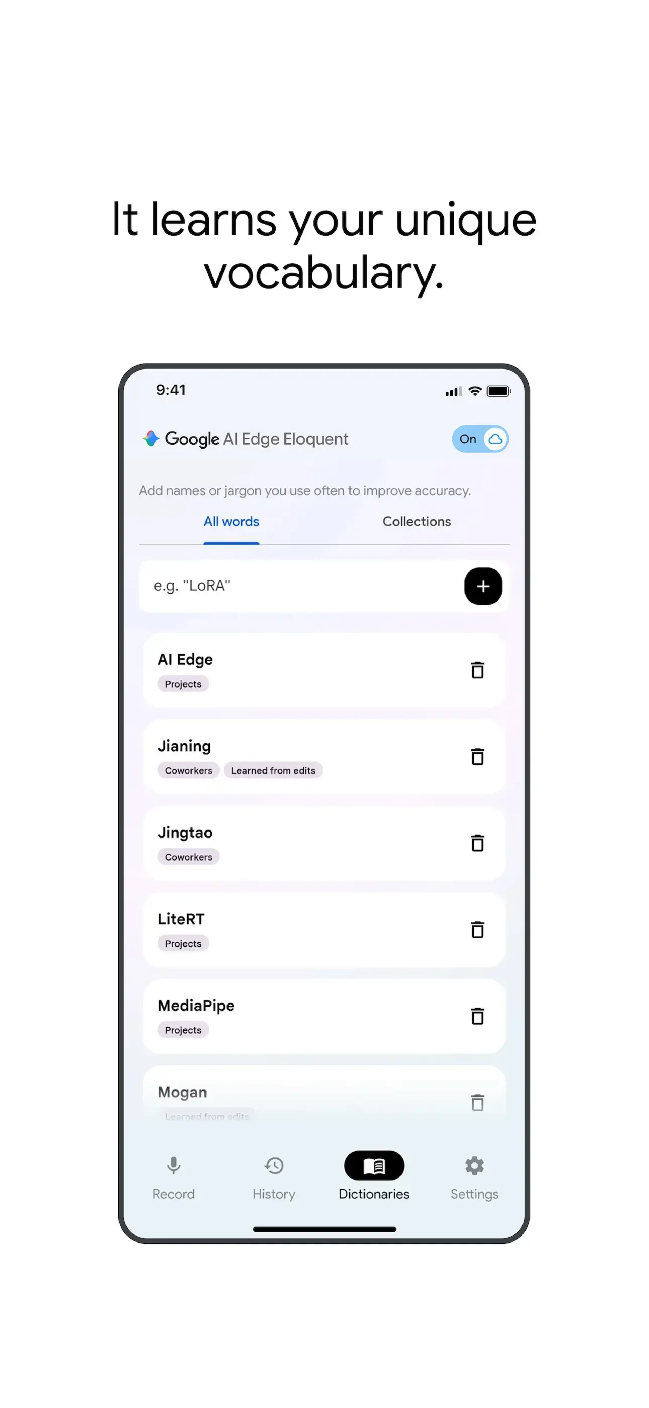 隐私和个性化是这款应用的另一重点:在“完全离线”模式下,所有音频都只在本机处理,不会上传服务器;开启云端增强时,语音识别仍先在本地进行,仅后续文本清理由云端完成。 用户可以在内置的 Dictionary 功能中添加常用人名、术语和行话,也可以选择从自己近期的 Gmail 已发送邮件中导入高频词,以提升识别率。