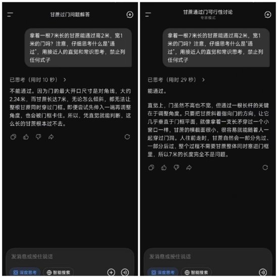 在数理问题处理上,专家模式较快速模式有着更优的表现。当被问及7米长的甘蔗能否通过高2米宽1米的门时,快速模式给出的是“不能通过”,但专家模式则给出了“可以通过”的确定性答案,且给出了甘蔗横截面小可像“长矛一样将其穿过”的形象比喻。