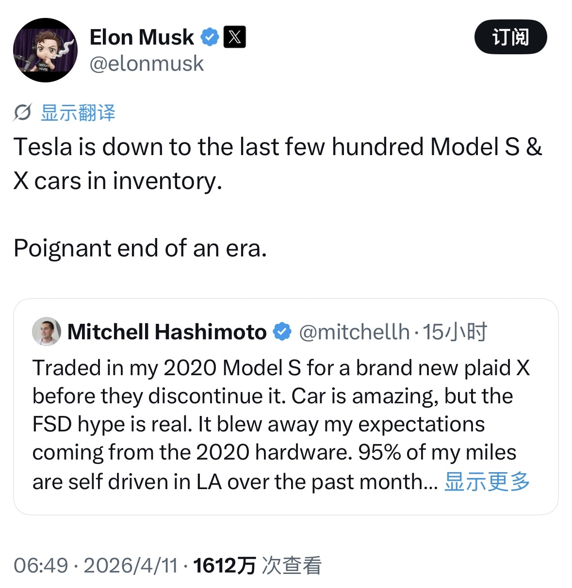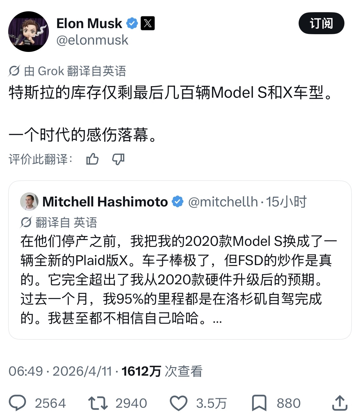 特斯拉CEO马斯克在社交平台发文称,特斯拉Model S和Model X的库存已经只剩最后几百台,一个时代迎来感伤的落幕。这条动态是马斯克回复一位用户的换车分享。有车主表示,在Model S/X停产前,用2020款Model S置换了全新的Plaid版Model X,体验后对FSD完全自动驾驶功能赞不绝口,称在洛杉矶过去一个月里,95%的里程都是自动驾驶完成,远超预期。