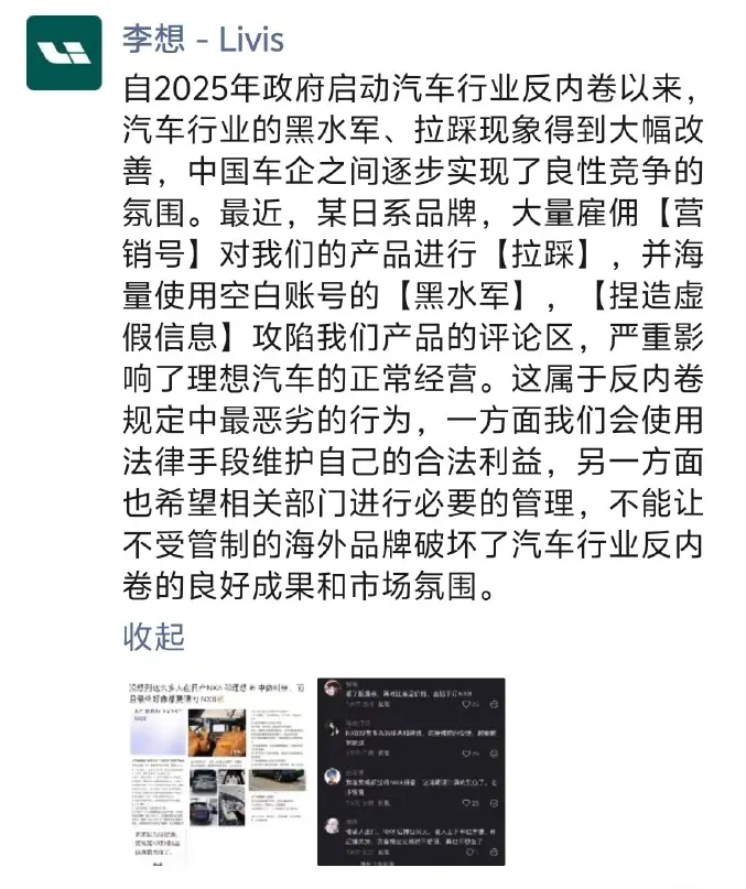 随后,李想又发文称,最近某日系品牌大量雇佣“营销号”对理想的产品进行“拉踩”,并海量使用空白账号的“黑水军”,“捏造虚假信息”攻陷理想产品的评论区,严重影响了理想汽车的正常经营。