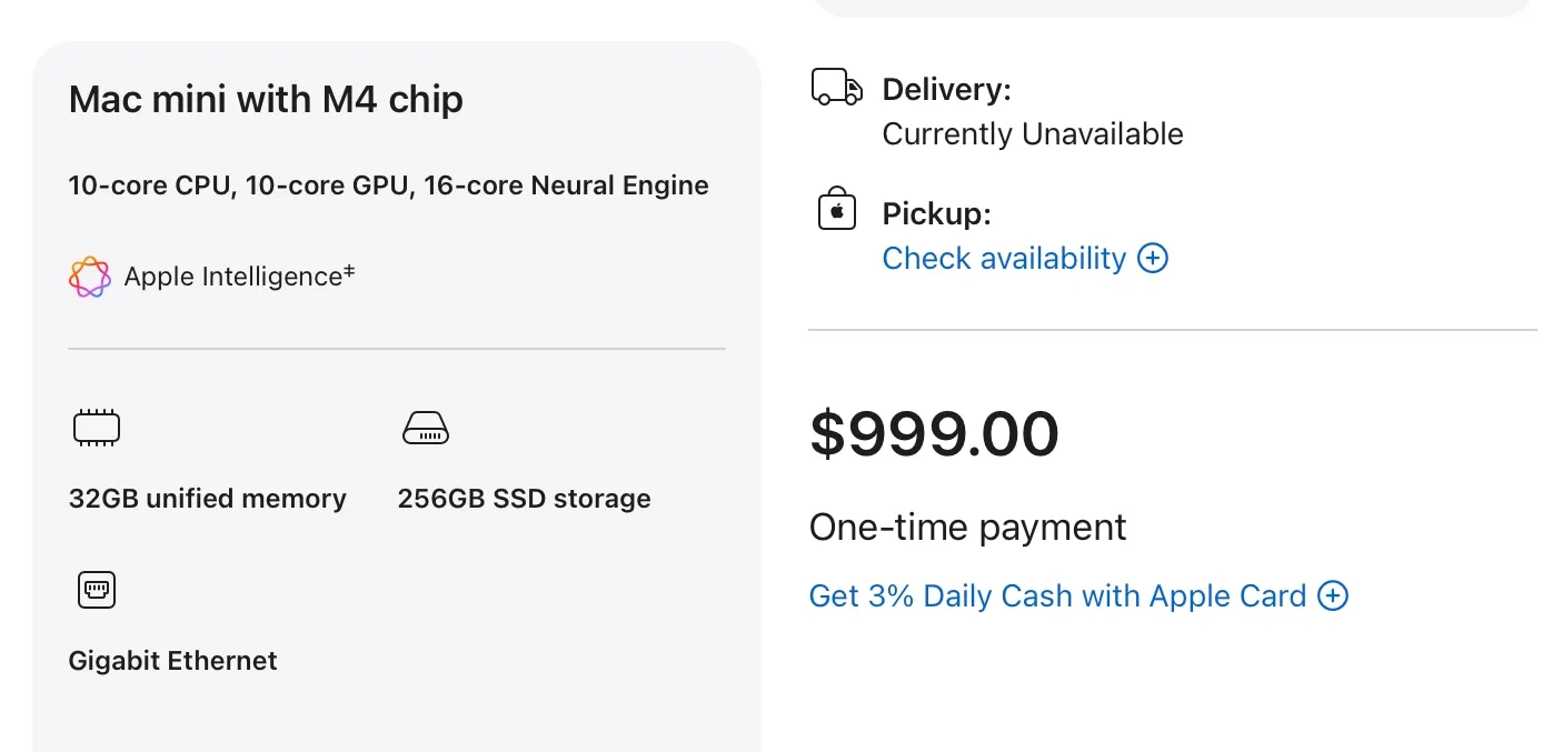 目前在苹果在线商店中,部分机型不仅发货时间被推迟,甚至已经无法下单购买。其中包括搭载 M4 芯片并配备 32GB 统一内存的 Mac mini,以及至少两种配置的 Mac Studio。