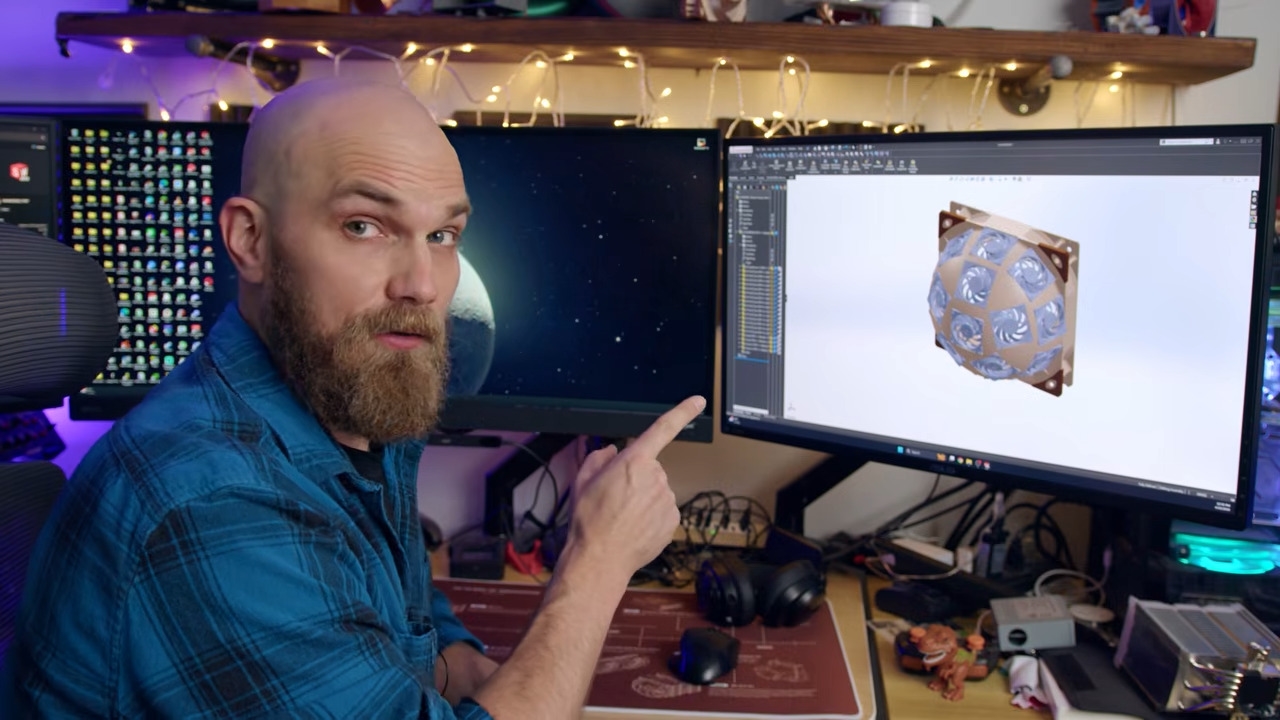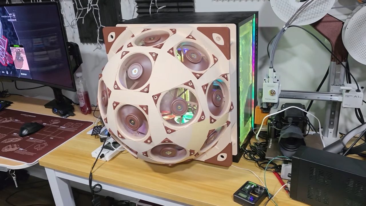老玩家对这位UP主应该不会陌生。上个月他打造“Fanhattan Project”同样塞下15把风扇的定制穹顶散热装置,当时就在硬件圈引发了热议。这次的超级穹顶,设计灵感正来自上期视频的用户评论。有玩家留言建议,不用小众小尺寸风扇,直接用标准规格的猫头鹰NF-A12x25 120mm风扇,替换机箱原装侧板做散热改造。