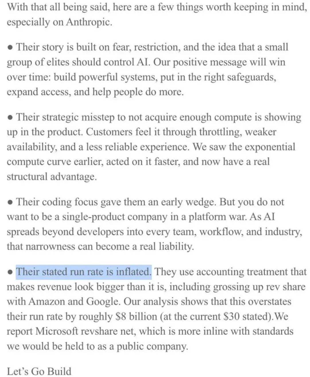 备忘录里说Anthropic这家公司“没有获取足够的算力是一个战略失误”,这导致客户在使用Claude时会遇到限流、可用性较弱和体验不够可靠的问题。