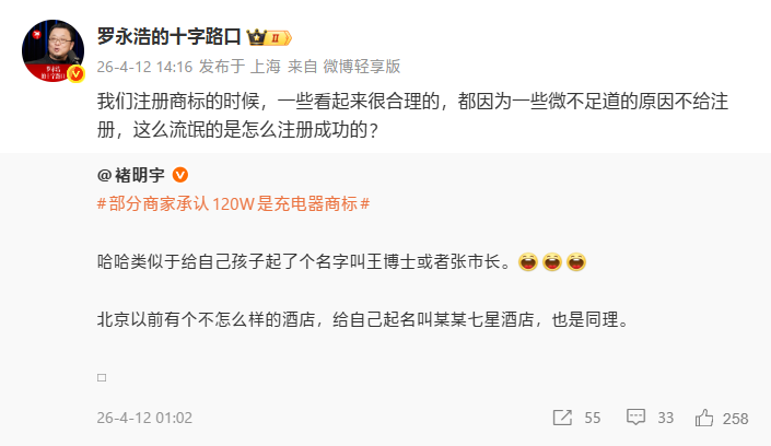 近日,罗永浩在微博公开吐槽,直指部分商家将“120W”注册为充电器商标,误导消费者以为是充电功率,引发全网热议。罗永浩直言:“这么流氓的(商标)是怎么注册成功的?”