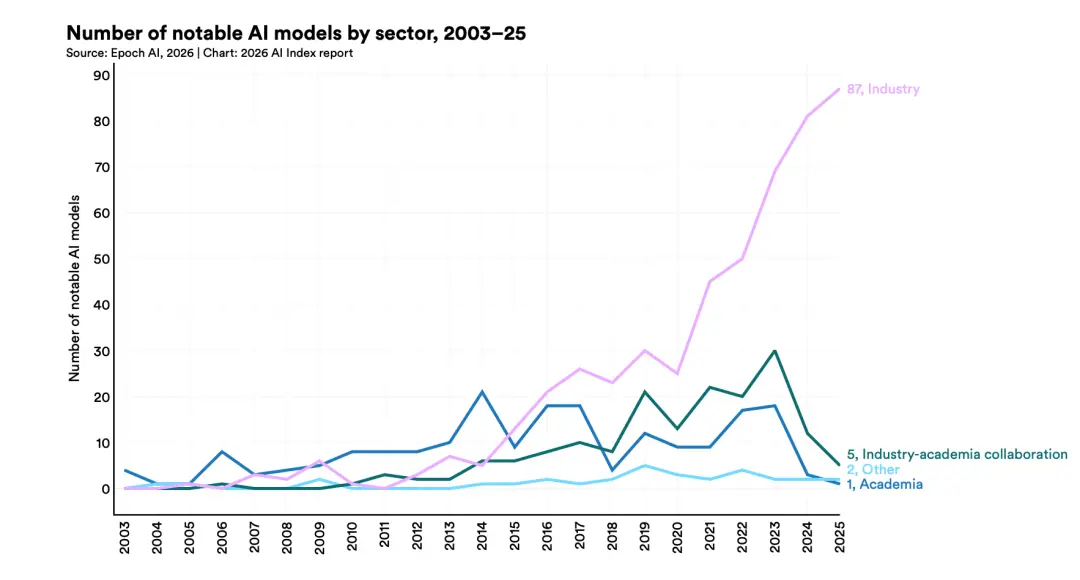 去年发布的95个最具代表性的模型里,超过九成都来自产业界,不是学术机构,也不是政府实验室。