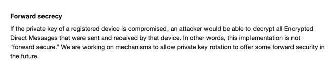 另外,X承认,XChat不具备“前向保密”(Forward Secure)功能,这是成熟的加密通信产品中最关键的保护层。这就意味着,如果某台已注册设备的私钥被攻破,攻击者就可以解开该设备此前收发过的全部加密消息。这与很多用户理解的“端到端加密”并不一致。