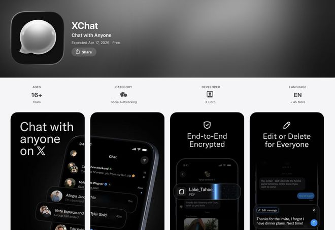 马斯克的超级应用野心,即将迈出关键一步。4月17日,X旗下独立加密聊天应用XChat将正式上线,现已开放苹果App Store预约。这款被视作X“微信化”的核心产品,主打“无广告、无追踪、端到端加密”,试图重构全球私密通信格局。