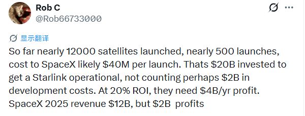 这种走钢丝般的财务结构引发了资本市场的深度忧虑。一位X平台用户通过拆解发射成本粗略算了一笔账。