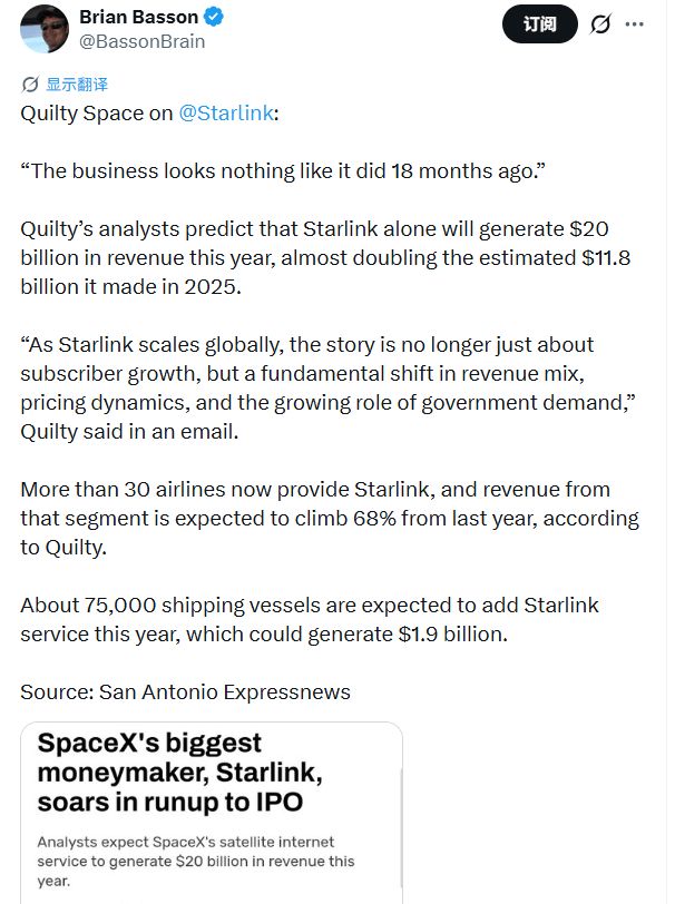 太空经济研究和咨询机构Quilty Space的分析师预测,今年仅星链这一单项业务就能产生200亿美元的强劲收入,几乎是2025年预估数值118亿美元的两倍。这也意味着星链单一板块的预期收入,即将全面超越SpaceX去年的公司总营收。