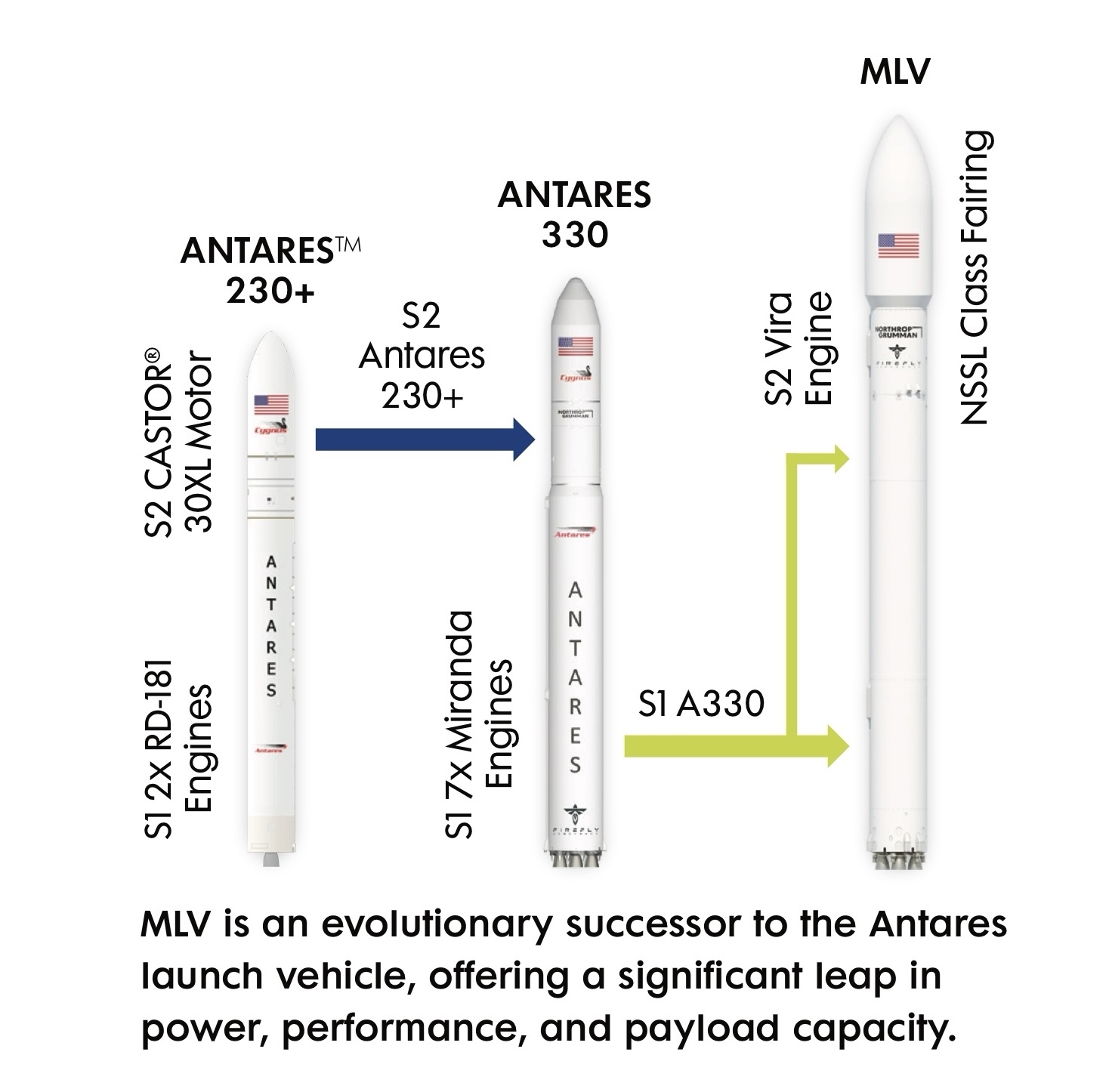 诺斯罗普·格鲁曼的新火箭是安塔瑞斯330,沿用旧火箭的固体发动机,芯一级则使用搭配萤火虫航天提供的七台发动机,预计今年首飞。