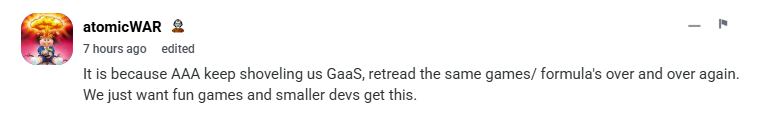 那么为啥3A大作失宠了?玩家的评论一针见血:“这是因为3A大厂总在硬塞给我们GaaS(游戏即服务)套路,反复炒冷饭、照搬一模一样的玩法公式。我们只想玩好玩的游戏,而小型开发商才真正懂玩家。”