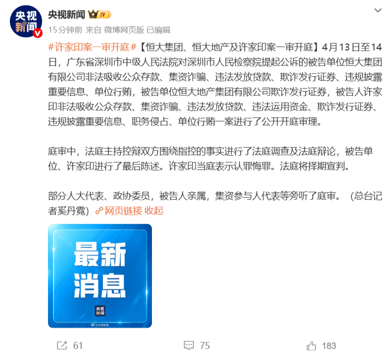 备受关注的恒大案件近期有了突破性进展。2026年4月13日至14日,广东省深圳市中级人民法院对恒大集团、恒大地产及许家印涉嫌非法吸收公众存款、集资诈骗、欺诈发行证券等案件进行了公开审理。
