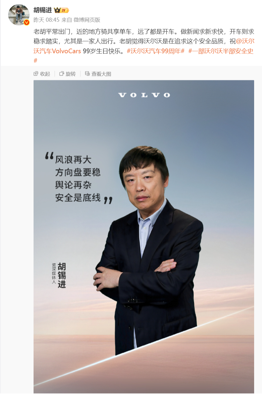 本是沃尔沃99周年生日,但代言阵营中里却出现了资深媒体人胡锡进,身份则为“品牌挚友”,引发网友热议。昨日,他在微博分享用车体验,为沃尔沃站台,而官方海报写着:“风浪再大,方向盘要稳;舆论再杂,安全是底线。”