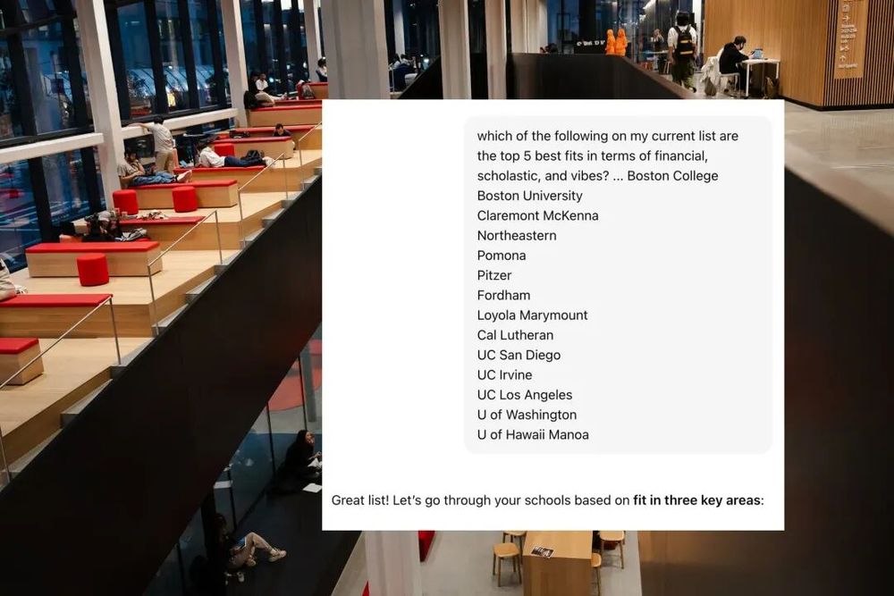 根据咨询机构Ruffalo Noel Levitz 2024年的调查,三分之一的高中生在使用AI规划大学申请。他们会让AI拉出一长串学校清单,把学费、奖学金、录取率整理成表格,用来快速做初筛,但他们不会让AI做判断。