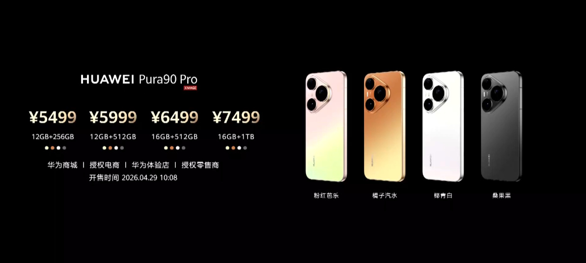 4月20日,在华为Pura系列及全场景新品发布会上,Pura 90系列手机正式亮相。新机共三款:标准版、Pro版和Pro Max版,全系采用利落直屏设计,主打简约精致,4699元起。
