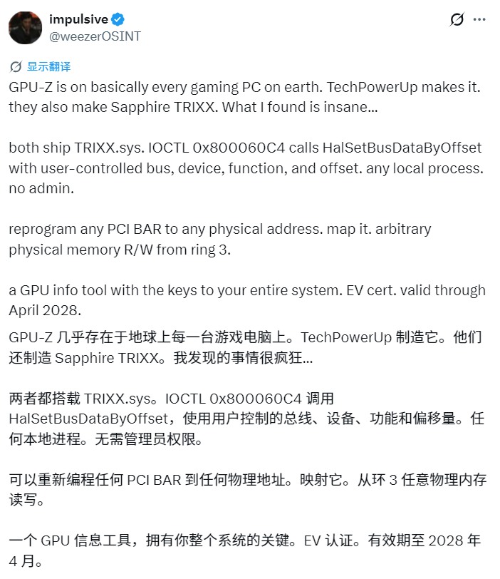 漏洞的核心在于TRIXX.sys驱动程序中的控制码IOCTL 0x800060C4,该控制码原本用于读取显卡硬件信息,但权限门槛极低,系统中任何普通程序均可向该驱动发送指令。