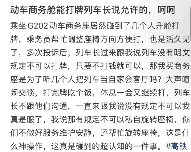 近日,有旅客在乘坐G202次动车商务座时,遭遇同车厢几名乘客升舱后聚众打牌、大声喧哗,严重影响乘车环境。当事人表示,自己购买商务座本是为了享受安静舒适的旅途,却不料被当成“公共客厅”,多次投诉后问题仍未得到有效解决,乘车体验十分糟糕。