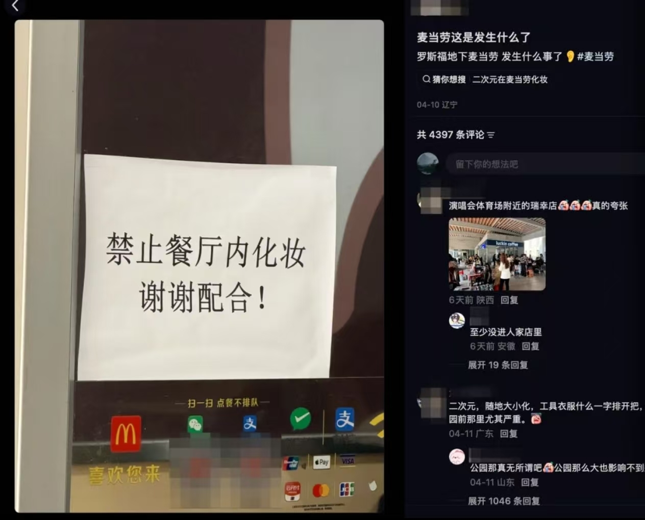 近日有网友发帖,晒出一家麦当劳内张贴的“禁止餐厅内化妆,谢谢配合”纸条,引发网友热议。网友还配文:“罗斯福地下麦当劳,发生了什么事?”。