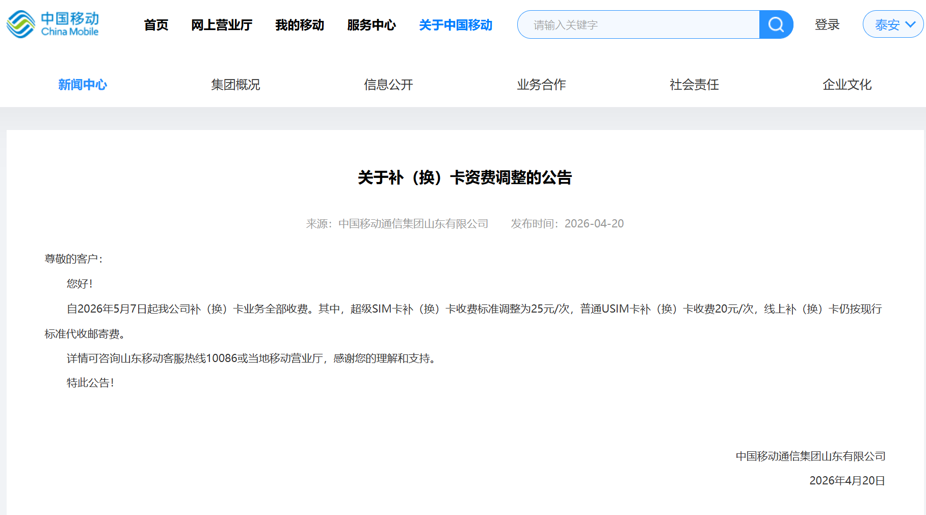 中国移动通信集团山东有限公司发布补(换)卡资费调整公告,明确自2026年5月7日起,该省范围内手机SIM卡补换卡业务将全面实行收费,不再提供免费办理服务。公告显示,此次收费标准按卡型区分,普通USIM卡补换卡费用为20元每次,超级SIM卡补换卡费用为25元每次。