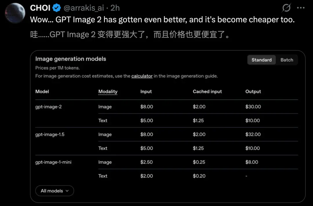 在定价方面,ChatGPT Images 2.0更强了,同时toekn输入/输出价格没有涨。