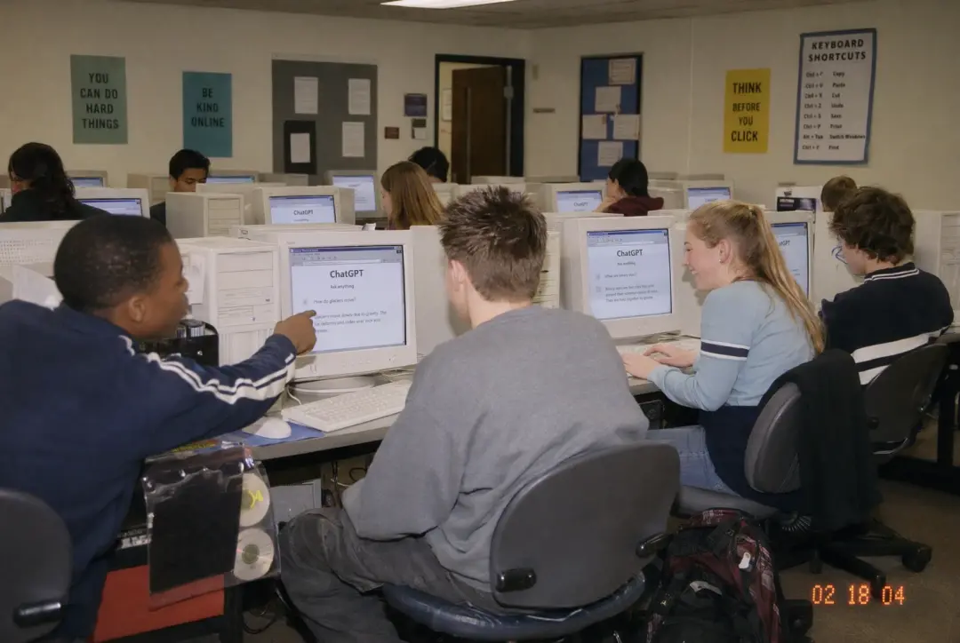 还有一组一次性相机风格的照片,模拟的是2000年代初美国高中电脑室的场景,学生们挤在米色CRT显示器前用ChatGPT。