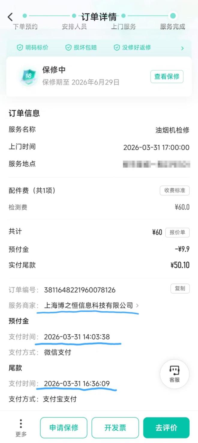 沈女士告诉记者,3月31日下午2点多,他在58同城APP下单,给住在闵行区的父母维修油烟机,在平台上“询问报价”后,她下了个订单。在她账号“我的订单”中,该订单的服务商家为:上海博之恒信息科技有限公司,检测费约60元,预付款9.9元。